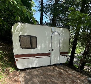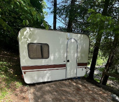 Pour 2 à 4 personnes. Auvent complet faisant terrasse avec gazinière, réfrigérateur et table à manger. Électricité comprise. Sanitaires communs. Linge de lit/serviettes de bains non fournis.